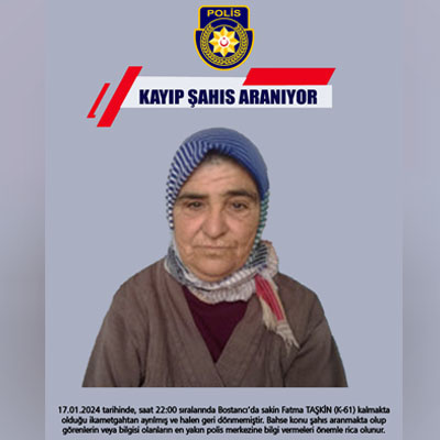 Bostancı sakinlerinden 61 yaşındaki Fatma Taşkın'ın dün akşam saatlerinden beri kayıp olduğu ve arandığı duyuruldu.