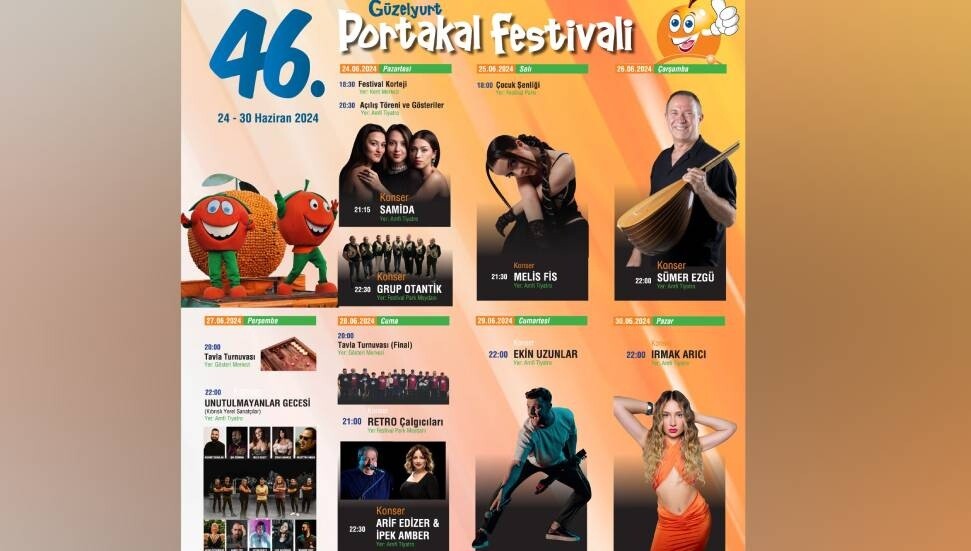 Birçok etkinliğe ev sahipliği yapacak 46. Güzelyurt Portakal Festivali’nde; Samida, Melis Fis, Sümer Ezgü, Ekin Uzunlar, Irmak Arıcı, yerel sanatçı ve müzik grupları konserler verecek, ayrıca yiyecek ve içecek stantlarının ücretsiz olacağı çocuk şenliği ve tavla turnuvası da yer alacak.
