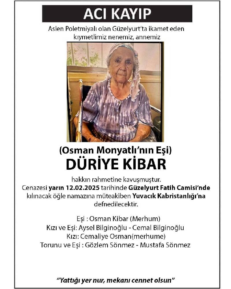 Güzelyurt’un tanınan isimlerinden merhum Osman Monyatlı’nın eşi Düriye Kibar hayatını kaybetti.