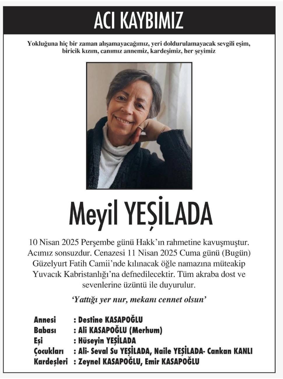 Meyil Yeşilada’nın cenazesi yarın Güzelyurt Fatih Camii’nde kılınacak öğle namazına müteakip Güzelyurt Kabristanlığı’na defnedilecek.
