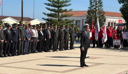 Güzelyurt Kaymakamlık binası karşısındaki Atatürk Anıtı önünde düzenlenen tören, protokol sırasına göre anıta çelenklerin sunulmasıyla başladı. Ardından saygı duruşu ve İstiklal Marşı eşliğinde bayraklar göndere çekildi.