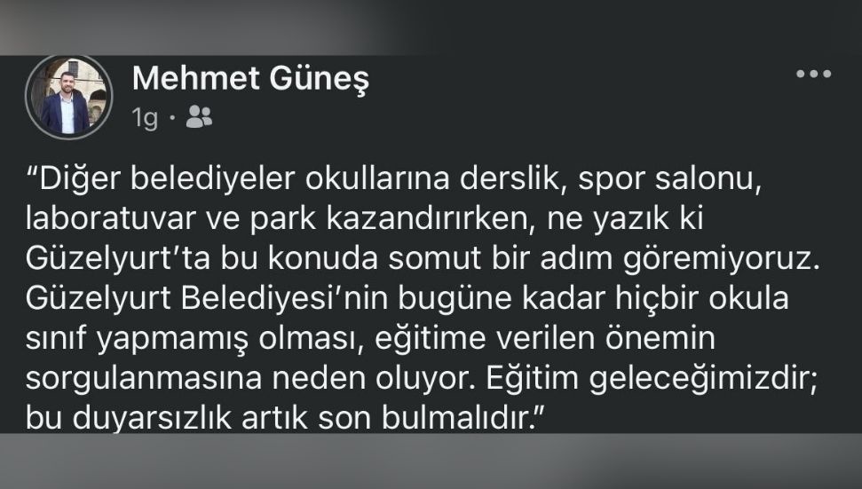 Güneş paylaşımında, “Diğer belediyeler okullarına derslik, spor salonu, laboratuvar ve park kazandırırken, ne yazık ki Güzelyurt’ta bu konuda somut bir adım göremiyoruz. Güzelyurt Belediyesi’nin bugüne kadar hiçbir okula sınıf yapmamış olması, eğitime verilen önemin sorgulanmasına neden oluyor. Eğitim geleceğimizdir; bu duyarsızlık artık son bulmalıdır” ifadelerini kullandı.