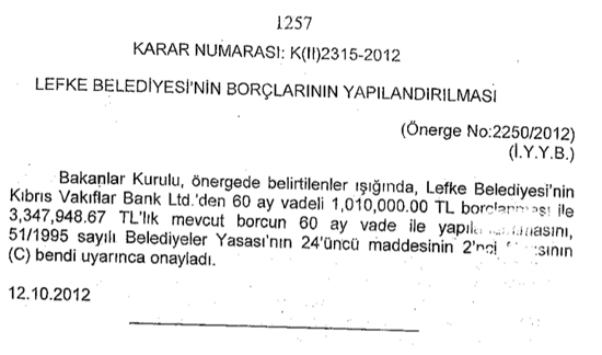 Kıbrıs Postası'nın elde ettiği bilgilere ve dayandırdığı belgelere göre, bu yılın Ekim ayında ise yine Bakanlar Kurulu kararı ile Lefke Belediyesi'nin 3.347.948.67 TL'lik borcuna 1. 010.000.00 TL'lik bir borcun daha eklenmesi kararını aldı ve 60 ay vadele ile yapılandırılması karara bağladı.