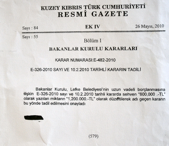 Bu toplantıdan 1 gün önce ve henüz Belediye Meclisnin kararı olmadan, Bakanlar Kurulu Belediye'nin 10 Şubat 2010 tarihinde E- 326-2010 sayılı kararı ile 800.000 bin TL'lik borçlanmasını onayladı. Daha sonra ise Belediye Meclisinin bilgisi dahilinde olmadan 800.000 TL'lik borçlanma 1 milyon 200 bin TL'ye yükseltildi. Bununla da kalınmayarak Bakanalar kurulu Belediye meclis kararı olmadan alınan bu borç yükseltme kararını aldı ve E- 482- 2010 sayılı kararı ile E- 326 sayılı kararını tadil ederek 800,000 bin TL'yi 1 milyon 200 bin TL'ye yükseltti.