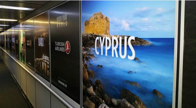 Kıbrıs sorunu nedeniyle Baf ve Larnaka'daki havalimanlarına uçuş gerçekleştiremeyen THY'nin, Sabiha Gökçen Havalimanı'ndaki reklam panolarında yer alan ve havayollarının uçuş güzergahlarını tanıtan afişlerden birinde yazan Cyprus ifadesi ve arka fondaki Baf Limanı, akıllara durgunluk verdi.