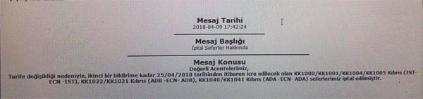 Söz konusu mesajda, ikinci bir bildirime kadar 25 Nisan 2018 tarihinden itibaren Ercan Adana, Ercan-İstanbul ve Ercan-İzmir seferlerinin durdurulduğu belirtiliyor.