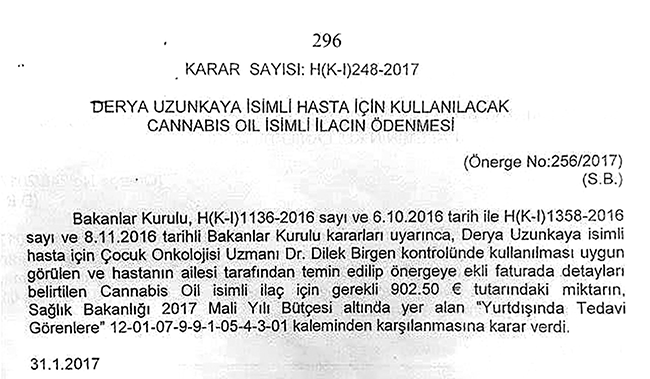 Resmi Gazete'de yayımlanan karara göre Derya Uzunkaya isimli hasta için Çocuk Onkolojisi Uzmanı Dr. Dilek Birgen kontrolünde kullanılması uygun görülen Cannabis Oil adlı ilaç için gerekli 902 euro tutarındaki miktarın, Sağlık Bakanlığı 2017 Mali Yılı Bütçesi'nden karşılanmasına karar verildiği açıklandı.