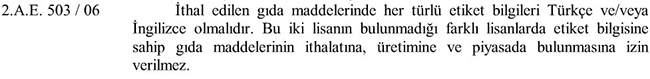 Kıbrıs Postası'na konuşan Bakanlık yetkilileri ise Besin ve Gıda Yasası'na atıfta bulunarak, 'İthal edilen gıda maddelerinde her türlü etiket bilgileri Türkçe ve/veya İngilizce olmalıdır. Bu iki lisanın bulunmadığı farklı lisanlarda etiket bilgisine sahip gıda maddelerinin ithalatına, üretimine ve piyasada bulunmasına izin verilmez' hükmünün getirildiğini hatırlattı. Yetkililer, yasa gereğince ithal ürünlerin açıklama kısmında Türkçe açıklama olma zorunluluğunun bulunmadığını ve İngilizce açıklama yazmasının ürünlerin piyasada bulunmasına yasal bir engel teşkil etmediğini açıkladı.