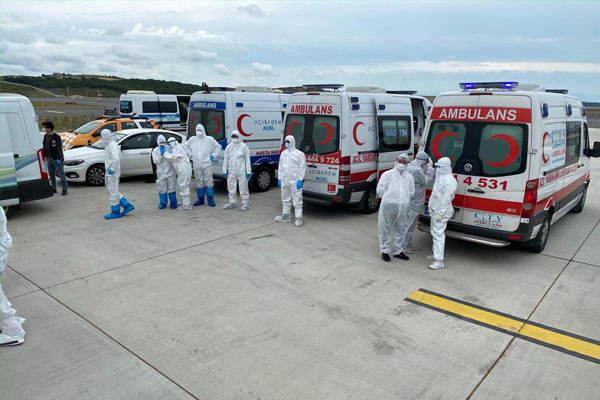 İstanbul Yeni Havaalanı’ndan kalkan Özmerter, Atatürk Havaalanı’na uçup tedavisi tamamlanan 1 bebek hasta, 1 çocuk hasta ve 2 refakatçileri ile 10 bin 000 adet hızlı test kiti alarak Ercan’a indi.