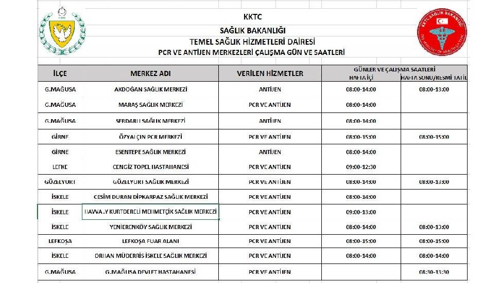 Bakanlıktan yapılan açıklamaya göre 6 ilçede toplam 13 merkezde Koronavirüs testleri yapılabiliyor. Test merkezlerinden 4'ü Gazimağusa, 4'ü İskele, 2'si Girne, bireri de Lefkoşa, Güzelyurt ve Lefke'de hizmet veriyor.