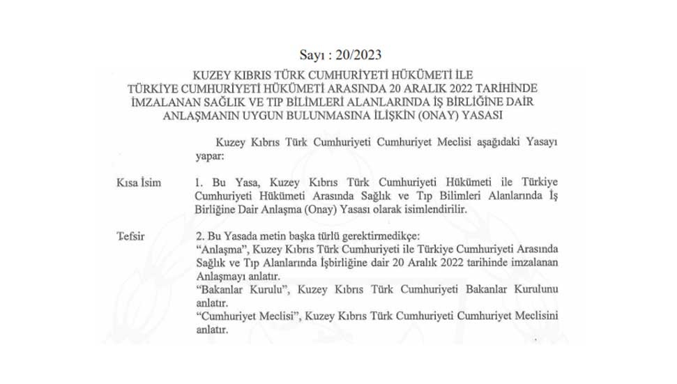 Kuzey Kıbrıs Türk Cumhuriyeti Hükümeti ile Türkiye Cumhuriyeti Hükümeti arasında 20 Aralık 2022 tarihinde imzalanan Sağlık ve Tıp Bilimleri Alanlarında İş Birliğine Dair Anlaşmanın Uygun Bulunmasına İlişkin (Onay) Yasası, 18 Mayıs tarihli Resmi Gazete’de yayımlanarak yürürlüğe girdi.