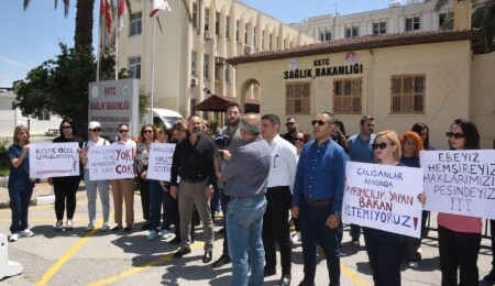 Kıbrıs Türk Amme Memurları Sendikası (KTAMS) ile Kıbrıs Türk Hemşireler ve Ebeler Sendikası (KTHES), terfi sınavlarının ertelemesi ve yıllardır terfi bekleyen sağlık çalışanlarının mağdur edilmesi gerekçesiyle Sağlık Bakanlığı önünde protesto eylemi düzenledi.