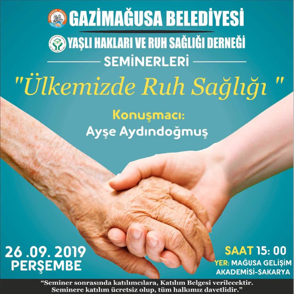 Mağusa'da yarın saat 15.00'da Yaşlı Hakları ve Ruh Sağlığı Derneği ile Mağusa Belediyesi işbirliğiyle Ayşe Aydındoğmuş tarafından "Ülkemizde Ruh Sağlığı" isimli seminer gerçekleştirilecek.