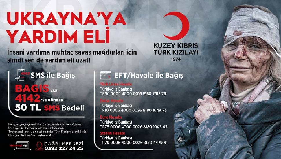 Kuzey Kıbrıs Türk Kızılayı Basın Bürosu’ndan yapılan açıklamada, savaş mağdurlarının acil ihtiyaçlarının karşılanması adına “Ukrayna’ya Yardım Eli” sloganıyla ayni ve nakdi yardım kampanyası başlatıldığı ve kampanya çerçevesinde toplanacak bağışların Türk Kızılay’ı aracılığıyla Ukrayna Kızılhaçı’na ulaştırılmasının hedeflendiği belirtildi.