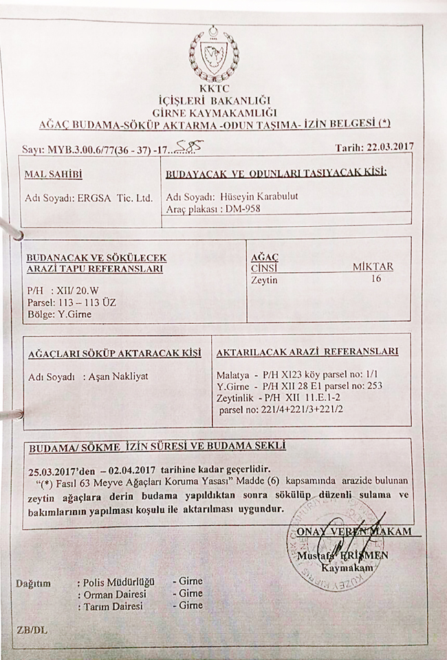 Girne Belediye Başkanı Nidai Güngördü, Zeytinlik bölgesinde Yapım İnşaat Şirketi'ne ait konut projesi kapsamında, inşaatın yapılacağı arazide bulunan zeytin ağaçlarının kesilmesi ile ilgili belediyede gerekli evrak bulunmadığını kaydederek, "Söz konusu arazide inşaat yapım faaliyetleri başladı ancak Yapım İnşaat Şirketi'nin bölgedeki zeytin ağaçlarını kesme izni ile ilgili sorun yaşandı. Kaymakamlık'tan alınan budama ve sökme izni 25 Mart 2017'den 2 Nisan 2017'ye kadar geçerliydi. Bu nedenle inşaat durduruldu" dedi.