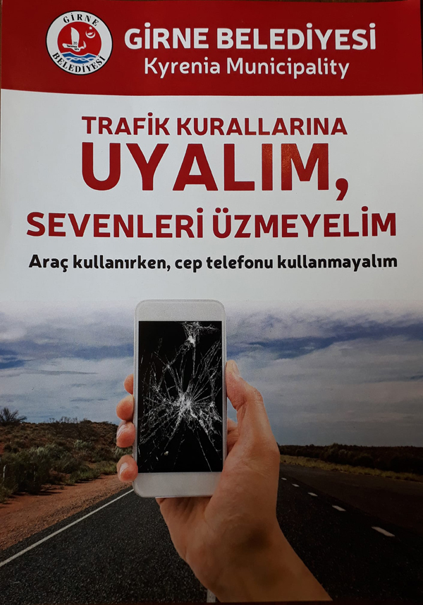 Girne Belediyesi, trafik konusunda halkı bilinçlendirmek ve trafikte yaşanan sorunlara dikkat çekip, farkındalık yaratmak amacıyla "Trafik Kurallarına Uyalım,Sevenleri Üzmeyelim - Araç Kullanırken Cep Telefonu Kullanmayalım" sloganıyla bildiri dağıttı.