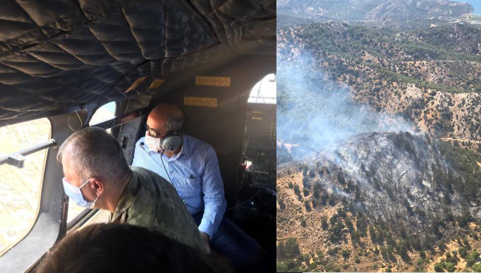 Cumhurbaşkanı Ersin Tatar, Başbakan Ersan Saner, Güvenlik Kuvvetleri Komutanı Tümgeneral Zorlu Topaloğlu ve Dışişleri Bakanı Tahsin Ertuğruloğlu yangın bölgesini helikopterle havadan inceledi.