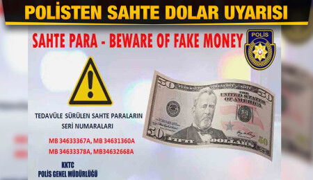 Polis Genel Müdürlüğü (PGM), Girne’de sahte ABD Doları banknotlarının tedavüle sürüldüğünü açıklayarak, vatandaşlara dikkatli olmaları, şüpheli kişileri polise bildirmeleri uyarısında bulundu.