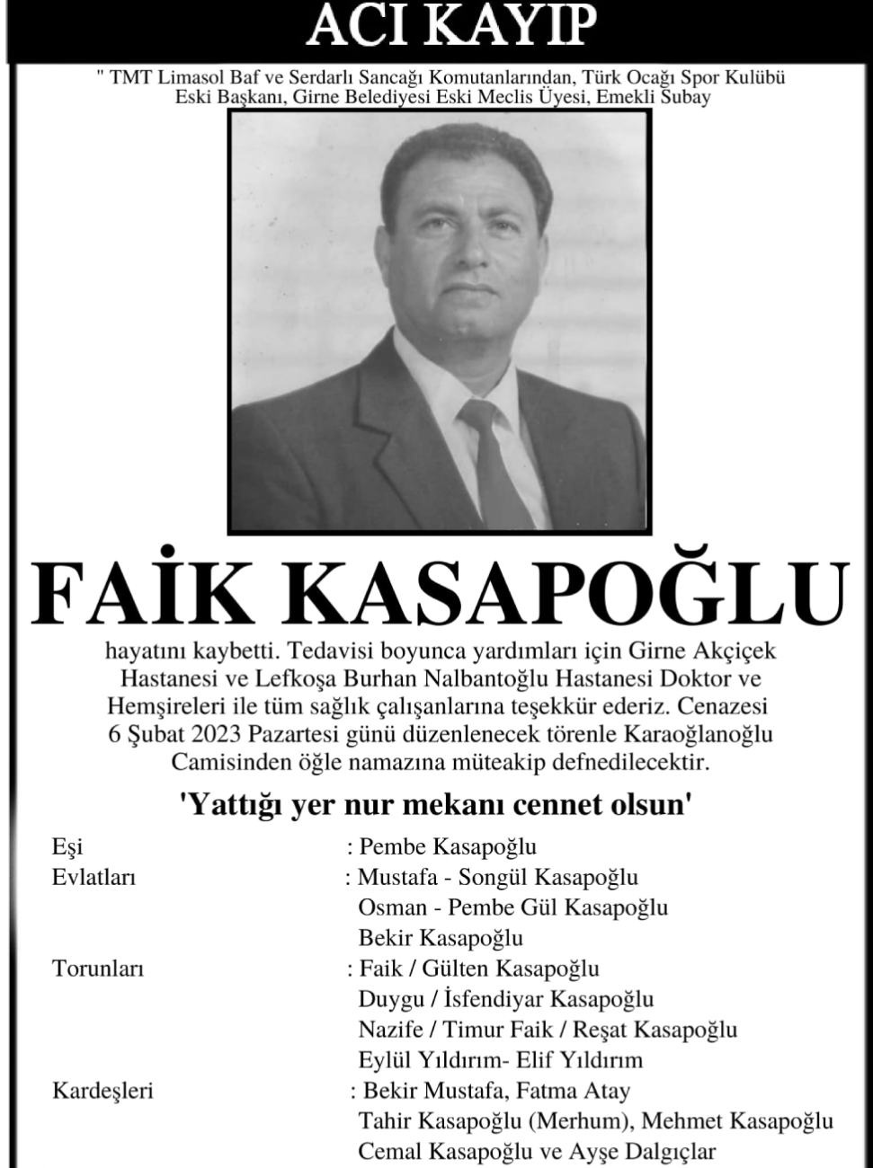 TMT Limasol Baf ve Serdarlı Sancağı emekli piyade üsteğmen, Türk Ocağı eski kulüp başkanı, Girne Belediyesi eski meclis üyesi Faik Kasapoğlu hayata gözlerini yumdu.