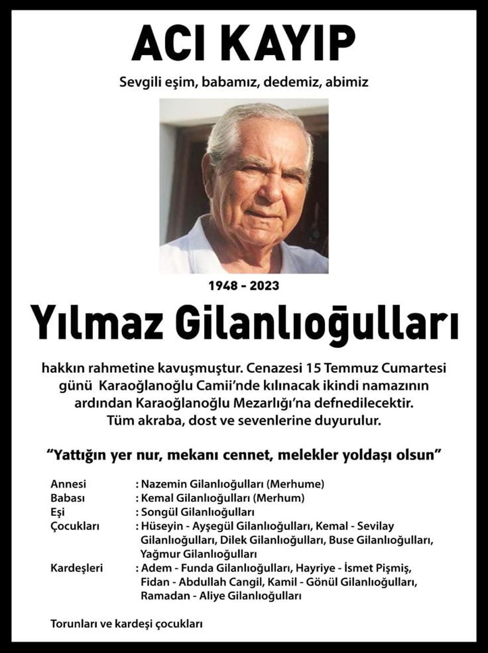 Gilanlıoğulları’nın cenazesi yarın Karaoğlanoğlu Camii’nde kılınacak ikindi namazının ardından Karaoğlanoğlu Mezarlığı’na defnedilecek.