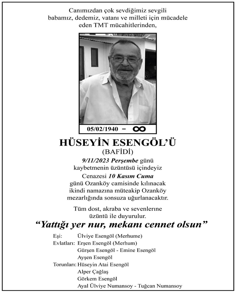 Hüseyin Esengöl'ün cenazesi 10 Kasım cuma günü Ozanköy Camiinde kılınacak ikindi namazına müteakip Ozanköy mezarlığına defnedilecek.