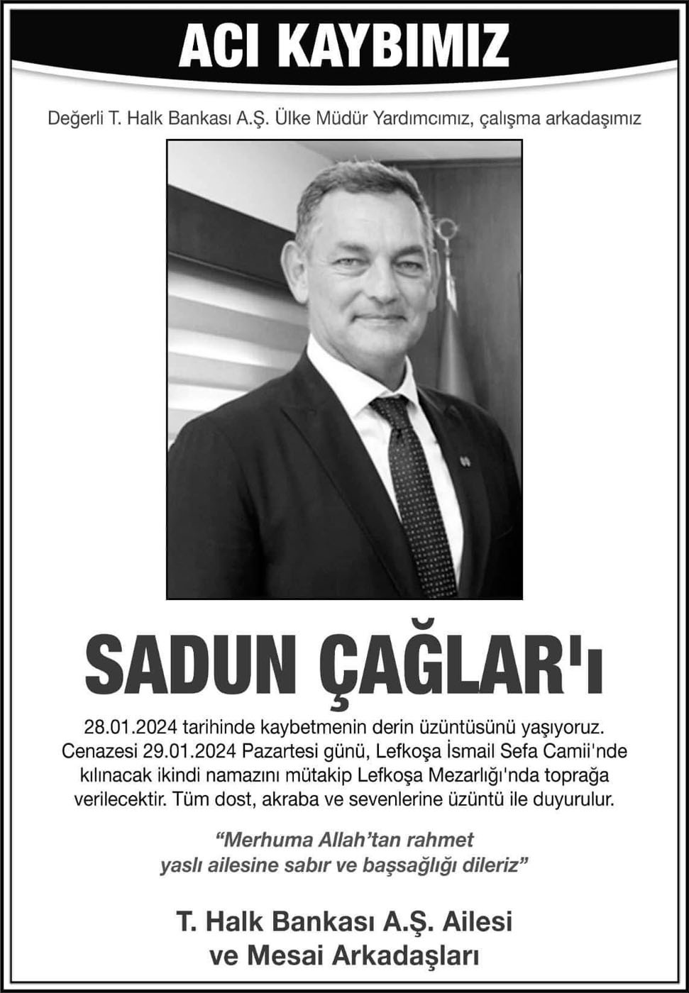 KKTC Halk Bankası Ülke Müdür Yardımcısı Sadun Çağlar yaşamını yitirdi.