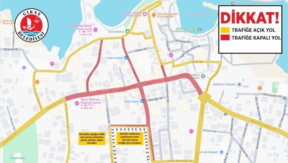 Girne Belediyesi’nin düzenlediği Çarşı Şenliği kapsamında, şehir merkezinde Ziya Rızkı Caddesi, Canbulat Sokak, Atatürk Caddesi ve diğer bazı yollar 30 Temmuz-1 Ağustos tarihleri arasında 17.00-23.00 saatleri arasında trafiğe kapatılacak. Atatürk Caddesi’nin belirli bölümü tek yön açık kalacak. İşletmeler, indirimli ürünleri kaldırımlarda sergileyebilecek ancak yayaların geçişi engellenmeyecek.