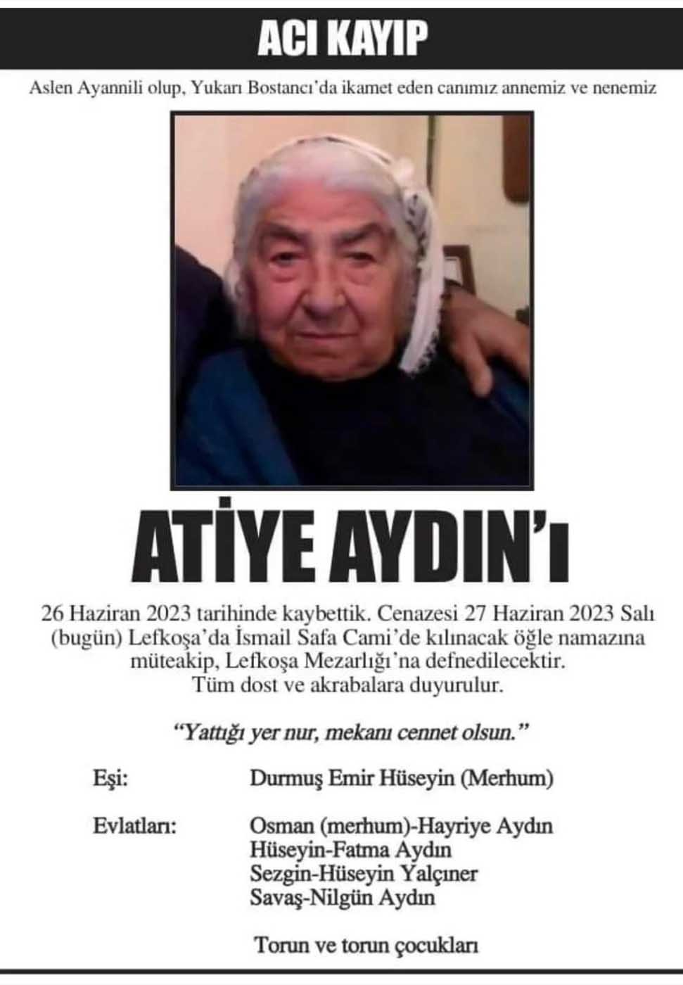 Lefkoşa sakinlerinden Atiye Aydın yaşamını yitirdi.