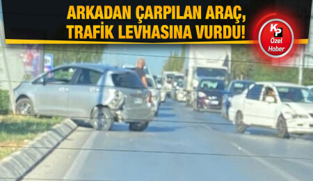 Arkadan çarpılan araç kazanın etkisiyle trafik levhasına vurdu.