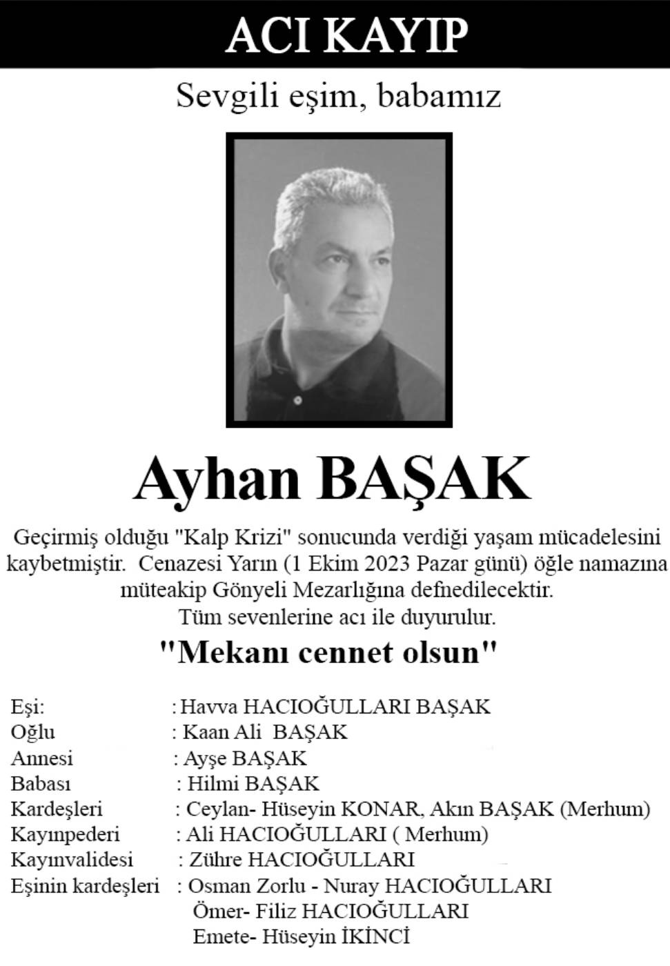 Lefkoşa sakinlerinden Ayhan Başak yaşamını yitirdi.