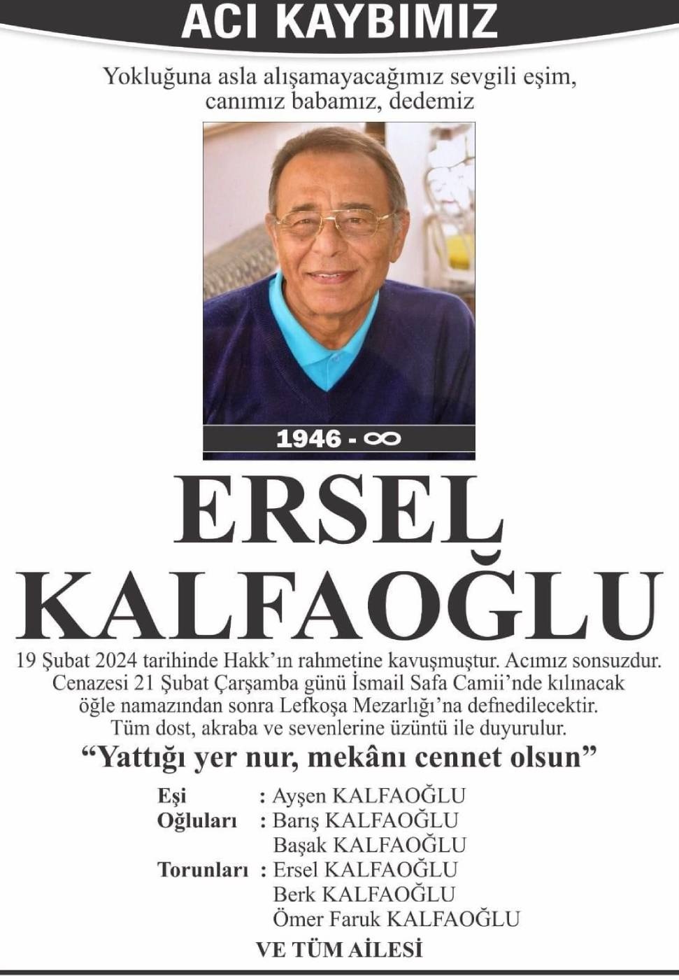 Ersel Kalfaoğlu hayatını kaybetti. Kalfaoğlu, 21 Şubat Çarşamba günü İsmail Safa Camii’nde kılınacak öğle namazından sonra Lefkoşa Mezarlığı’na defnedilecek.