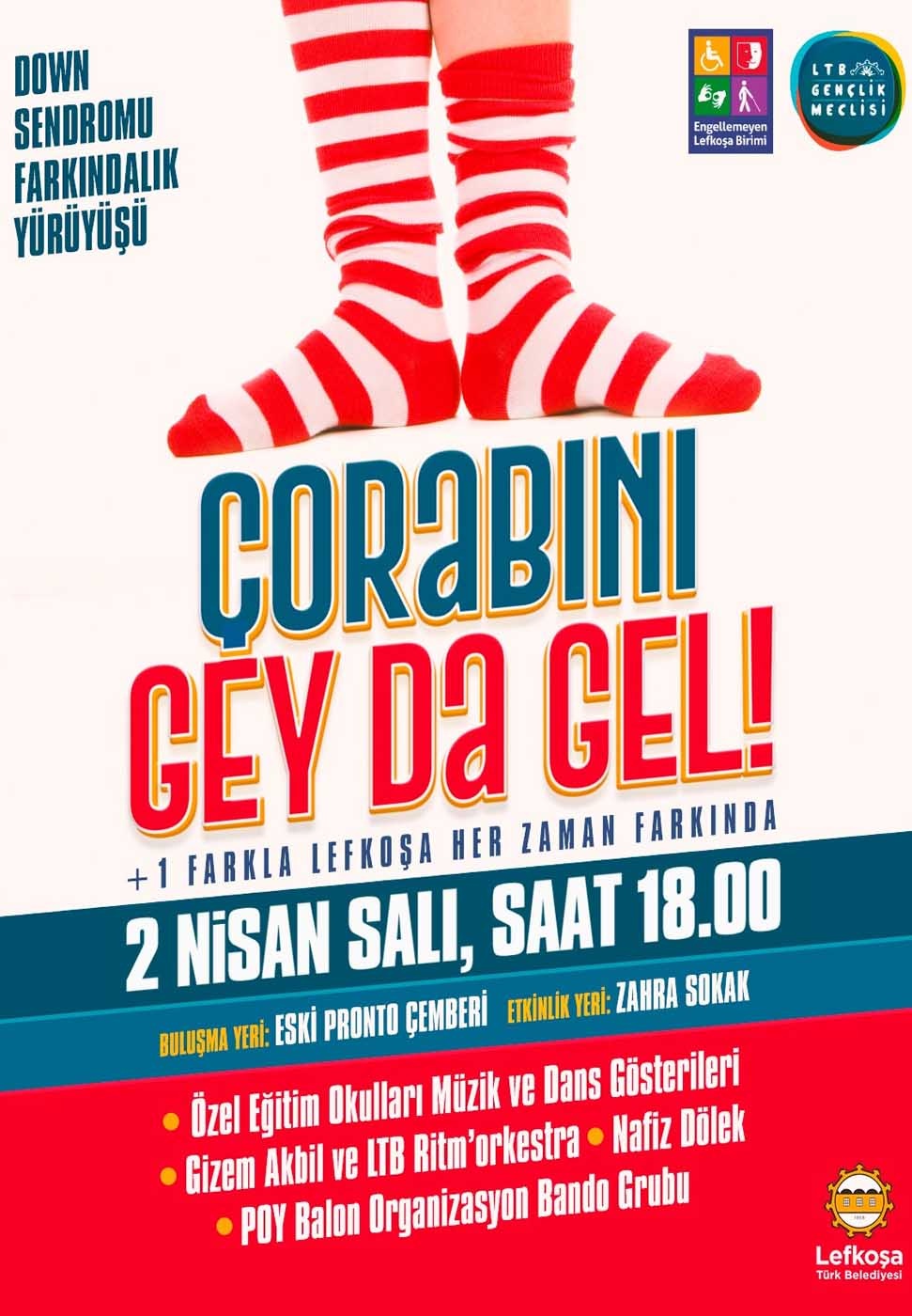 Lefkoşa Türk Belediyesi’nin (LTB) “+1 Farkla Lefkoşa Farkında” sloganı ile her yıl düzenlediği “Çorabını Gey da Gel Down Sendromu Farkındalık Yürüyüşü" kortej ve çeşitli performanslarla bugün yapılacak.