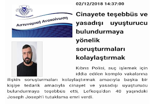 26 Kasım tarihinde Nicos Rodotheou'yu öldürmeye teşebbüs etmekle suçlanan İosif İosif'i Kıbrıs Rum polisi Kıbrıs Polis Haberleri sitesinde Joseph Joseph ismi ile aranan şahıs olduğunu duyurdu.