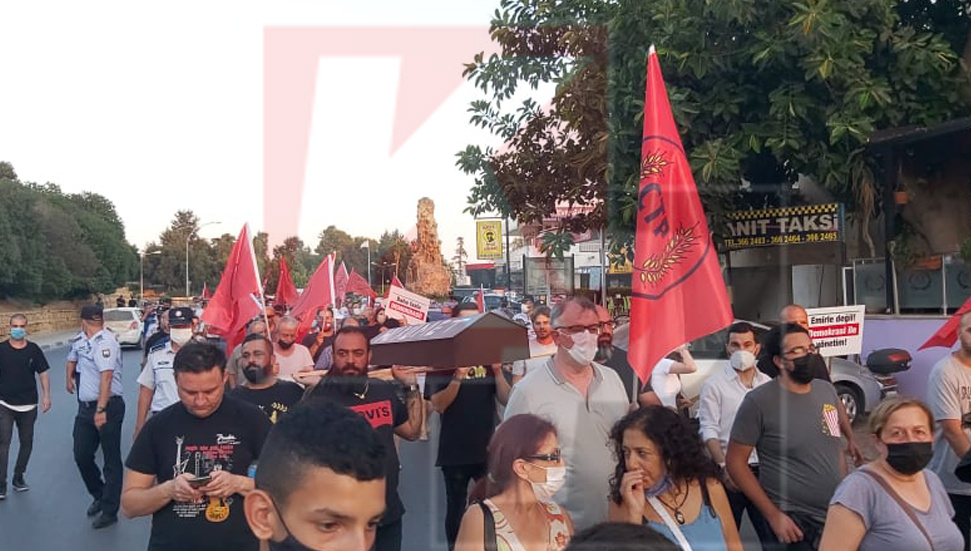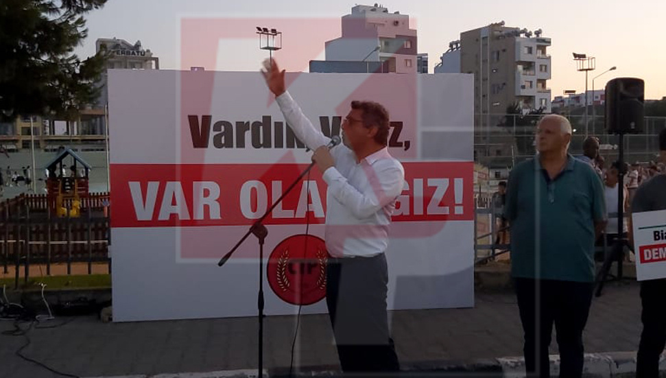Eylemde konuşan CTP Genel Başkanı Tufan Erhürman, “Onlarca yıldır Kıbrıs Türk halkı olarak uğurunda mücadele ettiğimiz ne varsa hepsini yerle bir etmeye sanki da ant içtiler. Bu memlekette taş üstüne taş, baş üstünde baş bırakmamaya ant içtiler. Ama bizim de bir andımız var biz de andımızı tekrarlıyoruz biz hep vardık hep varız hep de var olacağız.”