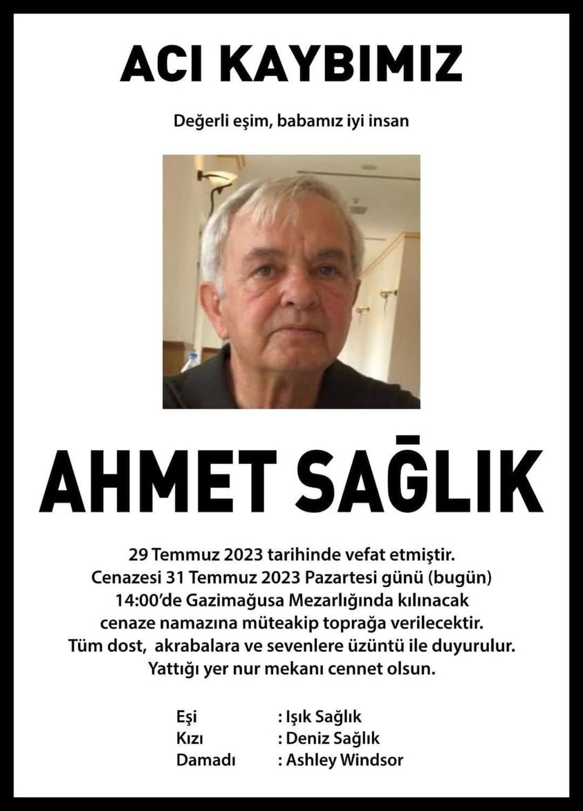 Gazimağusa’da ikamet eden 72 yaşındaki Ahmet Sağlık, yaşamını yitirdi.