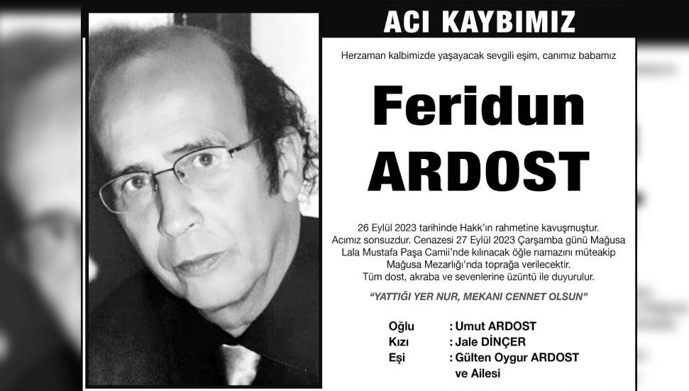 Feridun Ardost’un cenazesi yarın Mağusa Lala Mustafa Paşa Camii’nde kılınacak öğle namazına müteakip Mağusa Mezarlığı’nda toprağa verilecek.