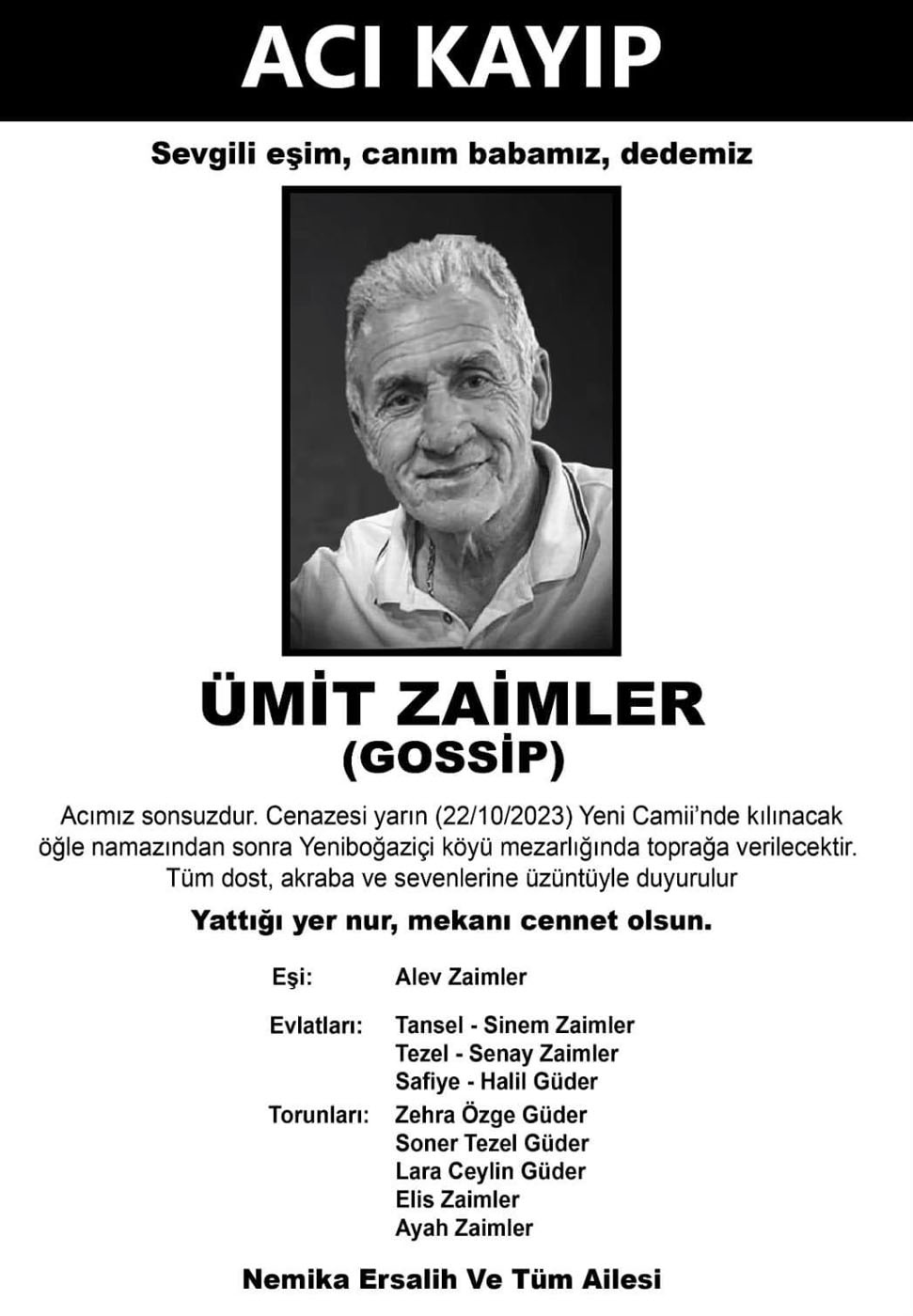 Ümit Zaimler hayatını kaybetti. Cenazesi 22 Ekim Pazar günü Yeni Camii’nde kılınacak öğle namazından sonra Yeni Boğaziçi köyü mezarlığında toprağa verilecektir.
