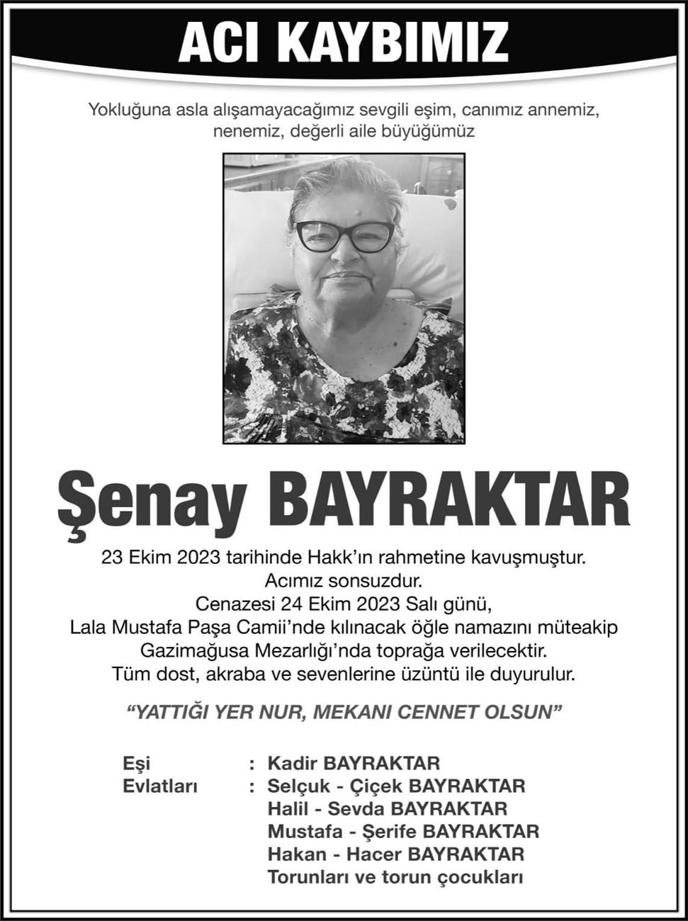 Gazimağusa’da ikamet eden Şenay Bayraktar yaşamını yitirdi.