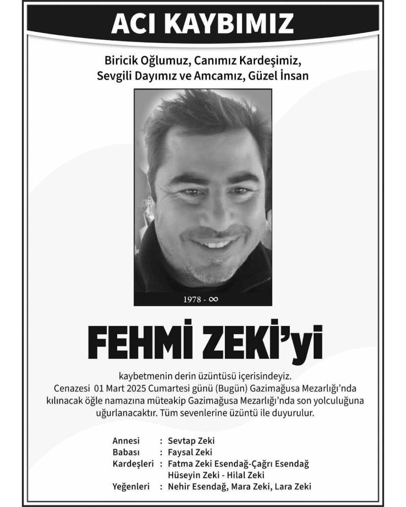 Fehmi Zeki, yarın öğle namazının ardından Gazimağusa Mezarlığı’nda son yolculuğuna uğurlanacak.