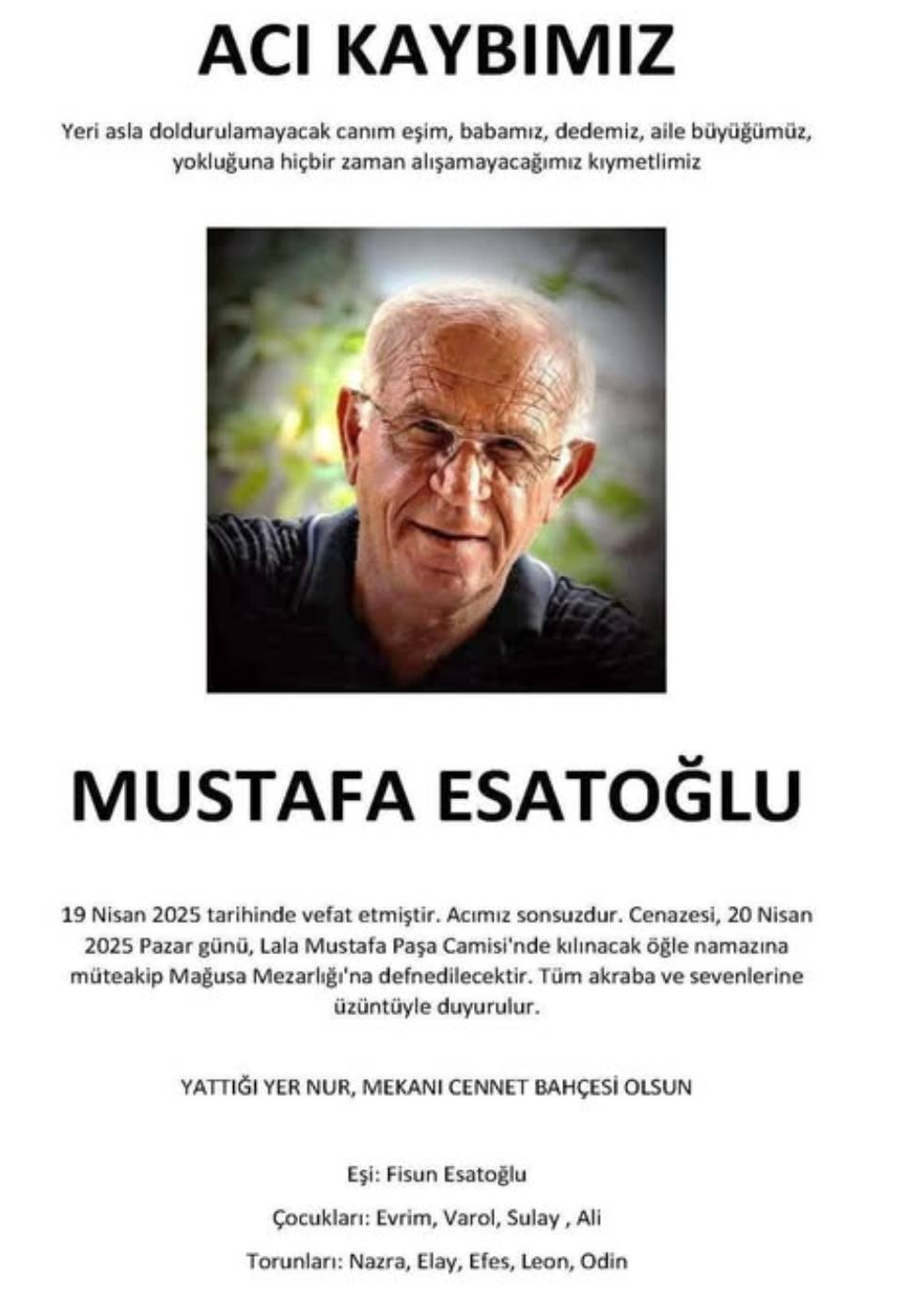 Gazimağusa sakinlerinden Mustafa Esatoğlu, yaşamını yitirdi.
