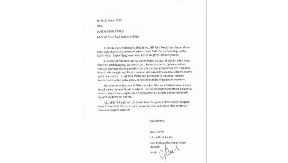 Demir, yaptığı yazılı açıklamada, "13 Kasım 2025 tarihinde UBP MYK ve UBP Parti Meclisi tarafından alınan karar doğrultusunda atanmış olduğum Ulusal Birlik Partisi Gazi Mağusa İlçe Kadın Kolları Başkanlığı görevimden, kendi isteğimle istifa ediyorum" ifadelerini kullandı.