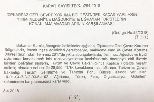 Dipkarpaz Özel Çevre Koruma Bölgesi'nde kaçak inşa edildikleri gerekçesiyle, mahkeme emri ile Çevre Koruma Dairesi tarafından yıkılan bungalovlarda Temmuz, Ağustos ve Eylül aylarında konaklamak için rezervasyonlarını kesinleştirmiş kişiler Turizm Bakanlığı'nca Kaplıca Hotel'de misafir edildi.