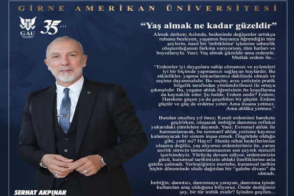 Girne Amerikan Üniversitesi (GAÜ) Kurucu Rektörü Serhat Akpınar, GAÜ’nün 35. Kuruluş yıldönümünde üniversitenin mezunlarını ve mezun adaylarını kutladı. Konuyla ilgili sosyal medya hesabından paylaşım yapan Akpınar, 35. Yılımızın Değerli Mezunları ve Mezun Adaylarımız . Sizleri kutluyorum . Congratulations of Our 35. th Anniversary Graduates and Candidates . “We Salute You”