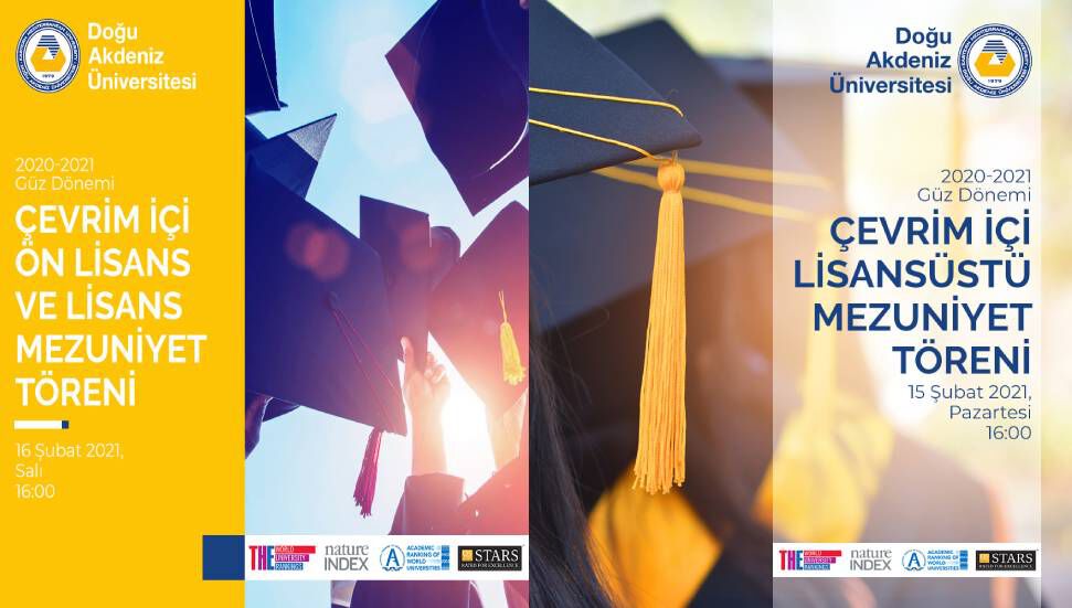 Çevrim içi olarak yapılacak olan 2020-2021 Akademik Yılı Güz Dönemi Mezuniyet Töreni, DAÜ resmi sosyal medya hesapları (Youtube - https://www.youtube.com/user/eastmeduniv, Instagram - @emuofficial ve Facebook – https://www.facebook.com/eastern.med.univ/) ile DAÜ TV sosyal medya hesaplarından (Facebook- https://www.facebook.com/dautvradyodau, Youtube - https://www.youtube.com/channel/UCOIg4ZnvKuW7c61GpoWWlMA) tüm dünyaya yayınlanacak. Lisansüstü Mezuniyet Töreni, 15 Şubat 2021 Pazartesi günü, saat 16:00’da; Ön Lisans ve Lisans Mezuniyet Töreni ise 16 Şubat 2021 Salı günü, saat 16:00’da yayınlanacak.