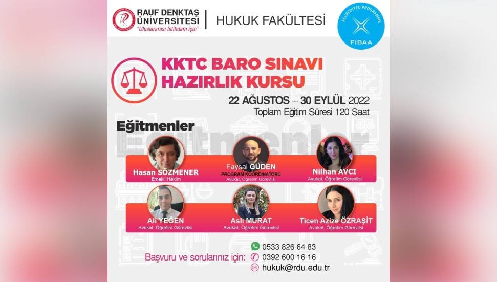 Rauf Denktaş Üniversitesi (RDÜ) Hukuk Fakültesinin düzenlediği KKTC Baro Sınavı Hazırlık Kursu 22 Ağustos Cumartesi günü başlıyor.
