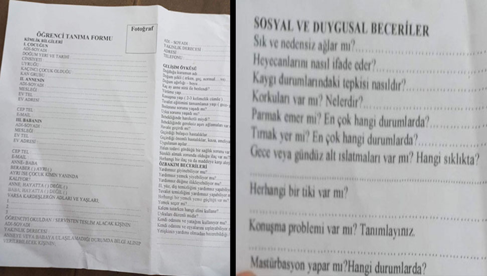Öğretmenin öğrencisini tanıması için velilere verilen ‘öğrenci tanıma formlarının’ dağıtımında bu yıl bir hata yaşandı... Ortaokul öğrencilerine yönelik ‘hassas içerikli’ soruların olduğu formlar, ilkokul öğrencilerinin velilerine dağıtılması sonrası okul yönetimlerine tepkiler geldi.