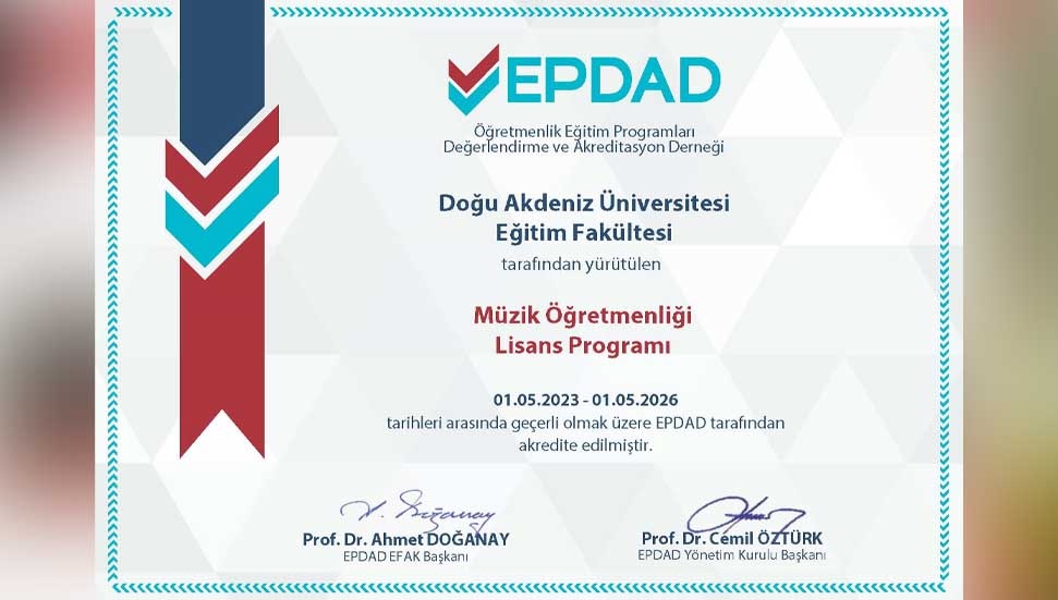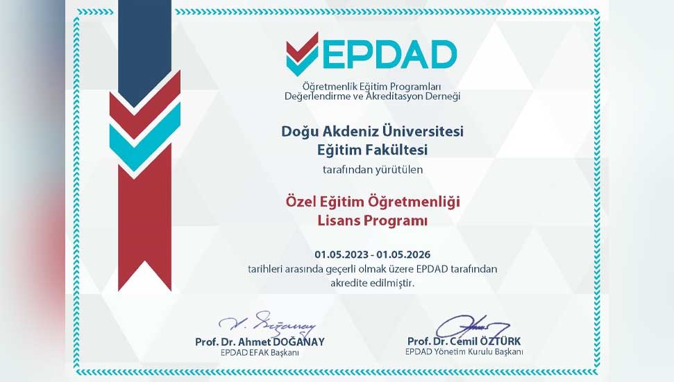 Doğu Akdeniz Üniversitesi (DAÜ) Eğitim Fakültesi’nde Güzel Sanatlar Eğitimi Bölümü’nün Müzik Öğretmenliği Programı ile Özel Eğitim Bölümü’nün Özel Eğitim Öğretmenliği Lisans Programları Eğitim Programları Değerlendirme ve Akreditasyon Derneği (EPDAD) tarafından akredite edilirken, Eğitim Bilimleri Bölümü, Rehberlik ve Psikolojik Danışmanlık Lisans Programı’nın halihazırda sahip olduğu EPDAD akreditasyon süresi yenilendi.