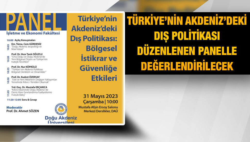 DAÜ İşletme ve Ekonomi Fakültesi’nde 31 Mayıs 2023 Çarşamba günü düzenlenecek panelde Türkiye’nin Akdeniz’deki dış politikası değerlendirilecek.