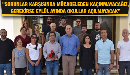 Kıbrıs Türk Orta Eğitim Öğretmenler Sendikası (KTOEÖS), bugün Gazimağusa’da Namık Kemal Lisesi bahçesinde, eğitim ve okulların içinde bulunduğu durumu değerlendiren basın toplantısı düzenledi.