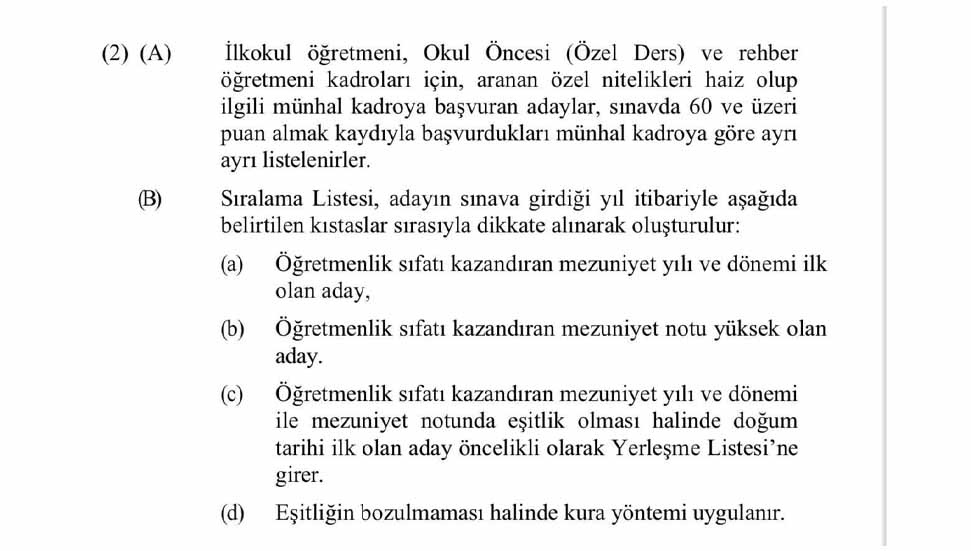 Ancak Köseoğlu, bu yıl yapılan tüzük değişikliğiyle birlikte ilkokul ve okul öncesi öğretmen alımlarında başarı puanı değil, mezuniyet yılına göre sıralama yapılmasının emredildiğini belirtti. Köseoğlu, "Tüzük değişse bile yapılacak sınavlar o tüzüğe göre sıralanır. Bu tüzük orada durduğu sürece uygulanacak. Öğretmen sendikası da tüzükten haberdardı" dedi.